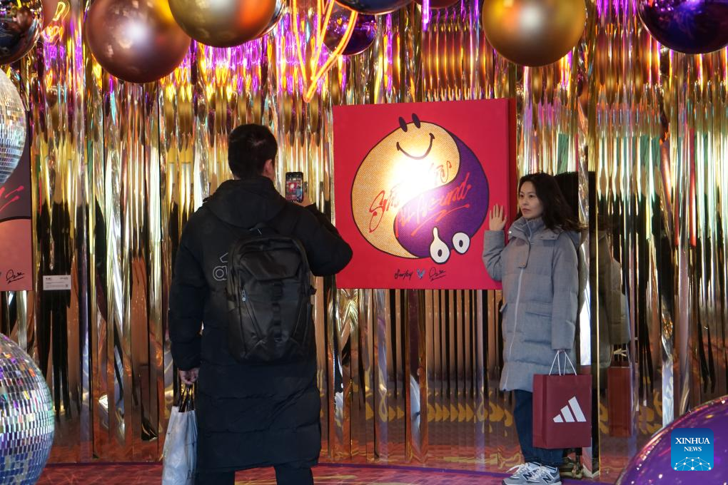 A tourist poses for a photo at Sanlitun, a popular shopping area during the Spring Festival holiday in Beijing, capital of China, Feb. 3, 2025. (Xinhua/Wang Yangang)