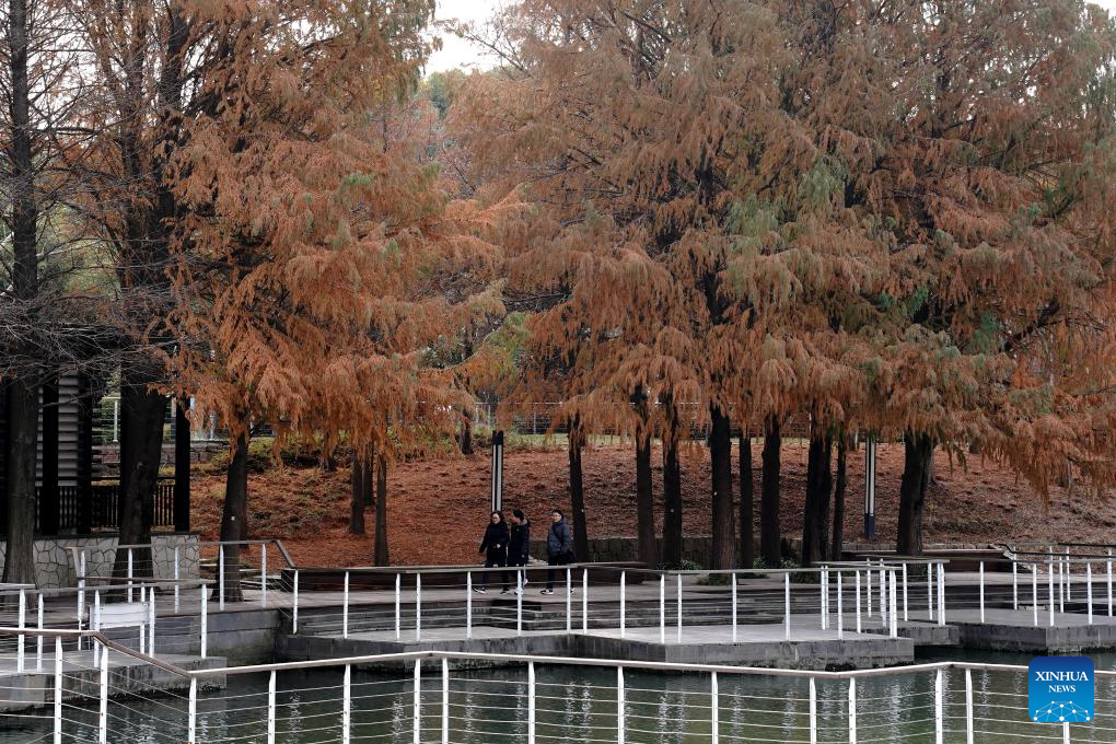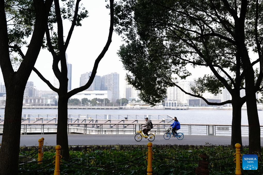 People ride bikes at Shanghai's World Expo culture park during the Spring Festival holiday in Shanghai, east China, Feb. 3, 2025. (Xinhua/Zhang Jiansong)