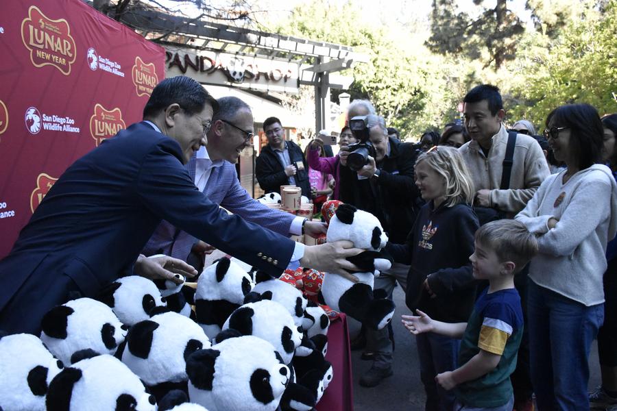 Paul Baribault (2nd L), president and CEO of the San Diego Zoo Wildlife Alliance, and Chinese Consul General in Los Angeles Guo Shaochun (1st L), distribute gifts to guests during a Chinese Lunar New Year celebration at the San Diego Zoo in San Diego, California, the United States, on Feb. 2, 2025. (Photo by Zeng Hui/Xinhua)