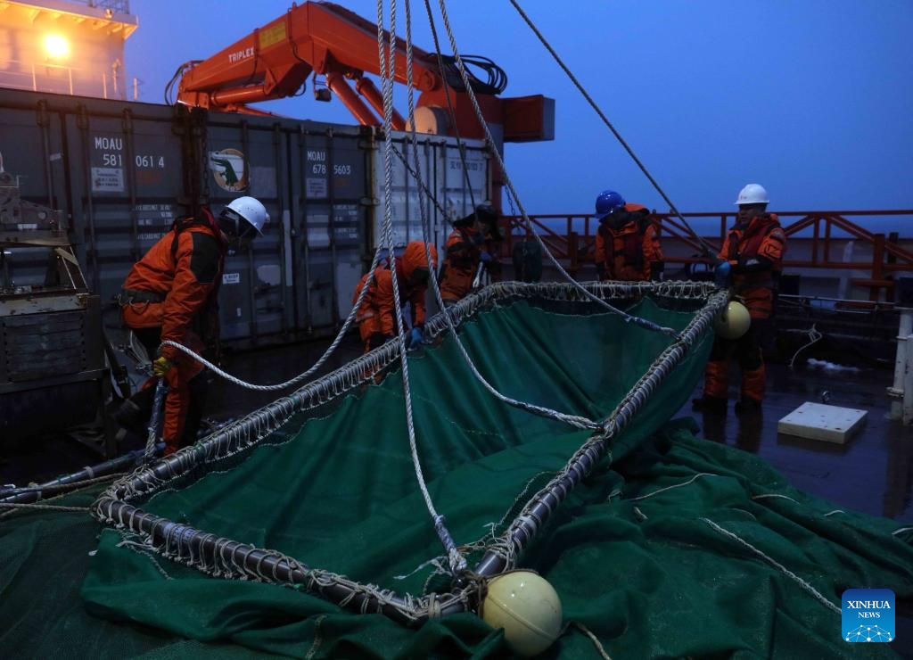 Members of China's 41st Antarctic expedition team check things netted by a retrieved trawl on Chinese research icebreaker Xuelong 2, Jan. 30, 2025. (Xinhua/Huang Taoming)
