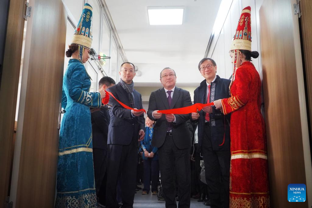 Guests cut a red ribbon at the launch ceremony of an academy of education in Almaty, Kazakhstan, Feb. 3, 2025. (Xinhua/Zhao Yu)