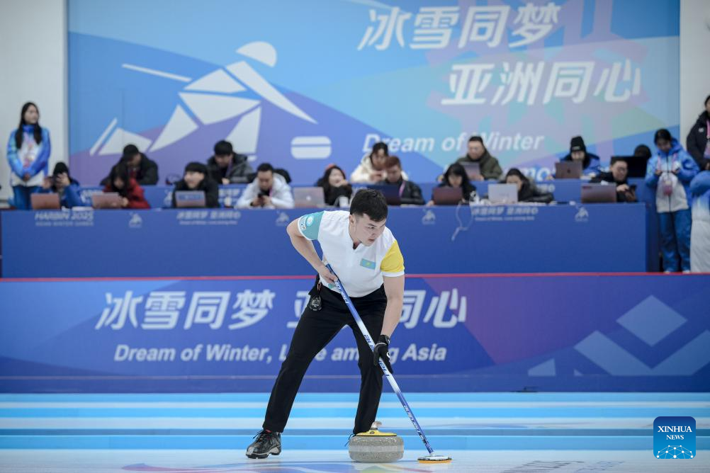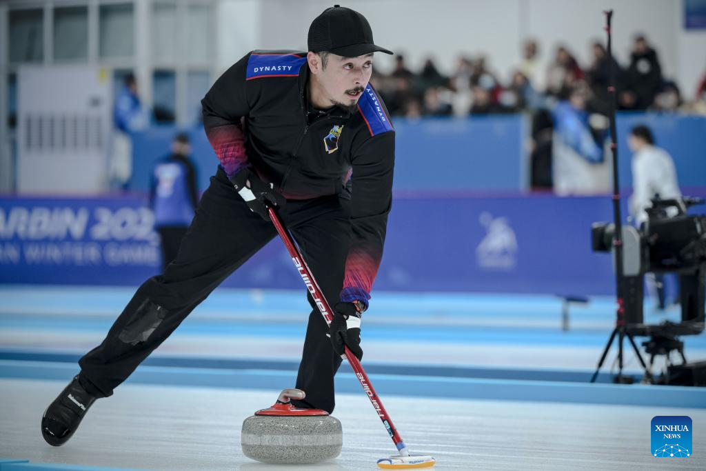 Azizbek Nadirbayev of Kazakhstan competes during the mixed doubles Round Robin Session 1 match between Amina Seitzhanova/Azizbek Nadirbayev of Kazakhstan and Han Yu/Wang Zhiyu of China in the curling event at 2025 Asian Winter Games in Harbin, northeast China's Heilongjiang Province, Feb. 4, 2025. (Xinhua/Jiang Han)