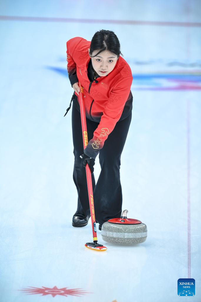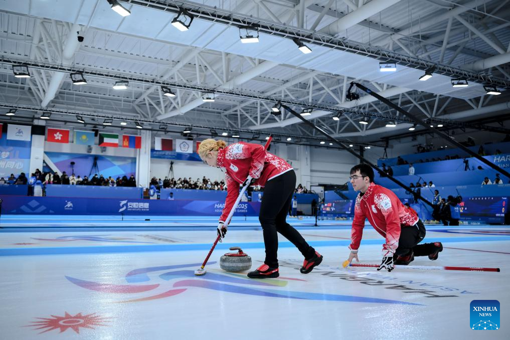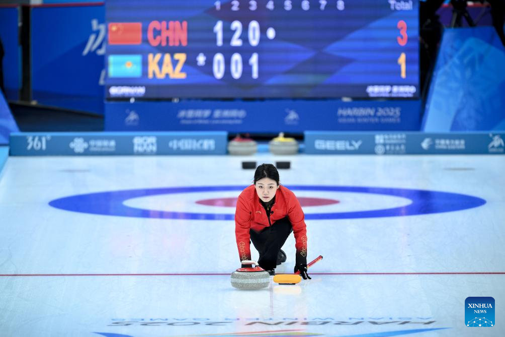 Han Yu of China competes during the mixed doubles Round Robin Session 1 match between Amina Seitzhanova/Azizbek Nadirbayev of Kazakhstan and Han Yu/Wang Zhiyu of China in the curling event at 2025 Asian Winter Games in Harbin, northeast China's Heilongjiang Province, Feb. 4, 2025. (Xinhua/Jiang Han)
