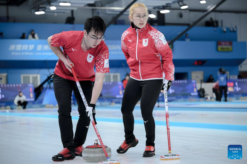 Koana Tori (R)/Aoki Go of Japan compete during the mixed doubles Round Robin Session 1 match against Chanatip Sonkham/Teekawin Jearateerawit of Thailand in the curling event at 2025 Asian Winter Games in Harbin, northeast China's Heilongjiang Province, Feb. 4, 2025. (Xinhua/Jiang Han)