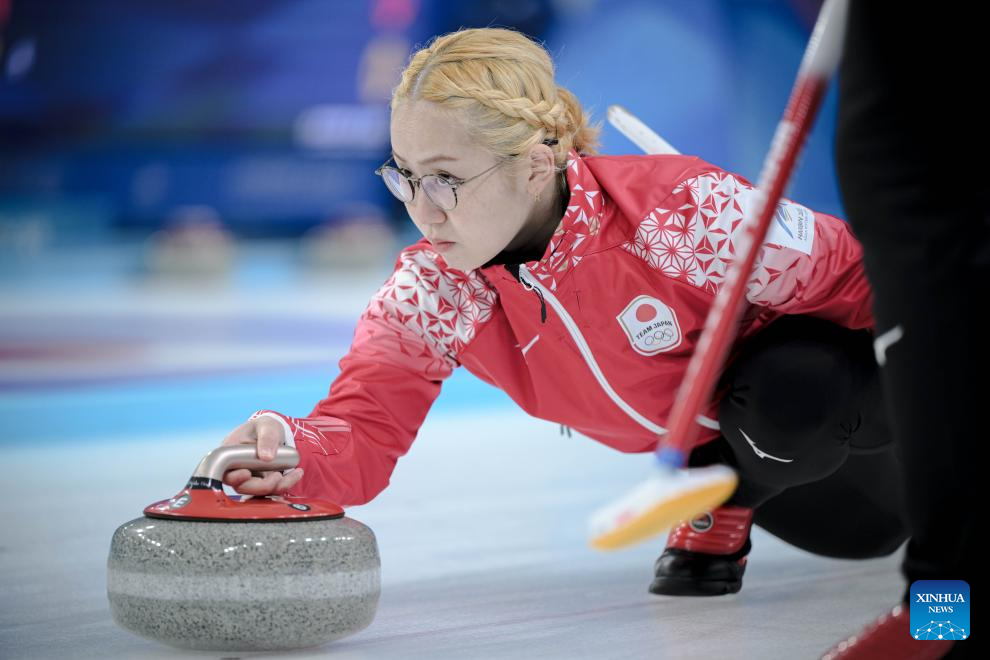 Koana Tori of Japan competes during the mixed doubles Round Robin Session 1 match between Koana Tori/Aoki Go of Japan and Chanatip Sonkham/Teekawin Jearateerawit of Thailand in the curling event at 2025 Asian Winter Games in Harbin, northeast China's Heilongjiang Province, Feb. 4, 2025. (Xinhua/Jiang Han)