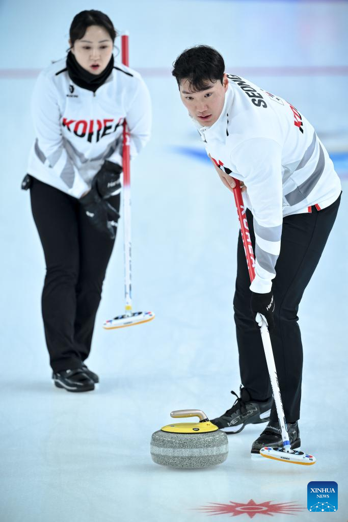 Kim Kyeongae (L)/Seong Jihoon of South Korea compete during the mixed doubles Round Robin Session 1 match between Kathleen Sumbillo Dubberstein/Marc Pfister of the Phillipines and Kim Kyeongae/Seong Jihoon of South Korea in the curling event at 2025 Asian Winter Games in Harbin, northeast China's Heilongjiang Province, Feb. 4, 2025. (Xinhua/Jiang Han)