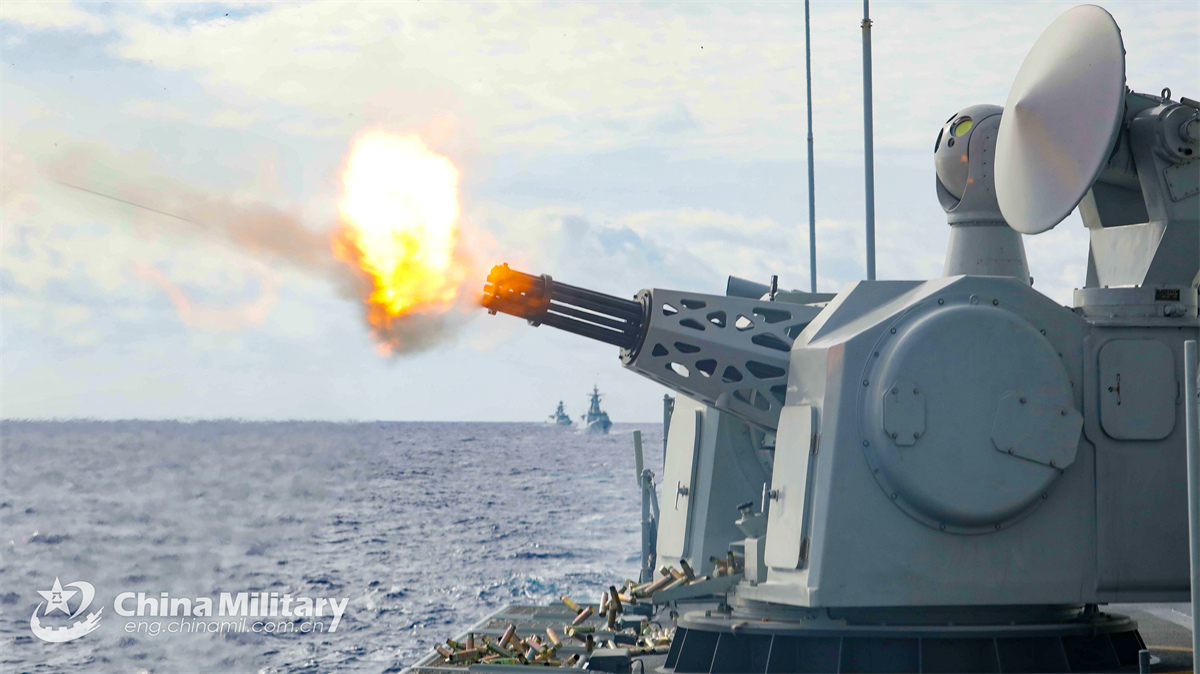 A naval frigate attached to the Chinese PLA Eastern Theater Command fires its close-in weapon system during a live-fire training exercise on December 21, 2024. (eng.chinamil.com.cn/Photo by Liu Jia)