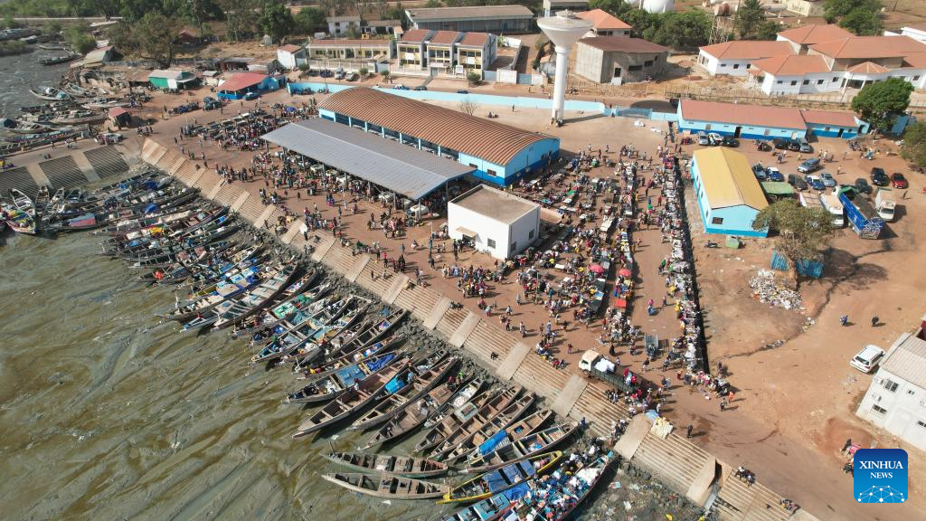 An aerial drone photo taken on Feb. 2, 2025 shows the fish market at the Bandim Fisheries Wharf in Bissau, the capital of Guinea-Bissau. (Xinhua/Si Yuan)