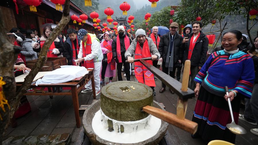 Foreign tourists try to make tofu during a folk celebration of the Spring Festival in Wayaogang Village, Yongding District of Zhangjiajie City, central China's Hunan Province, Jan. 24, 2025. (Photo by Liu Zijing/Xinhua)