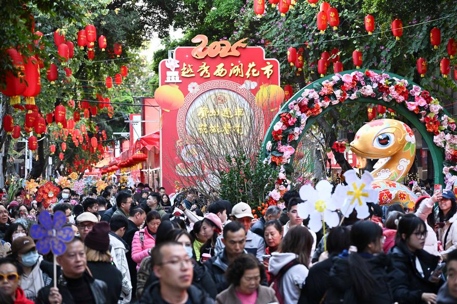 People visit a flower market in Yuexiu District, Guangzhou, south China's Guangdong Province, Jan. 27, 2025. (Xinhua/Deng Hua)