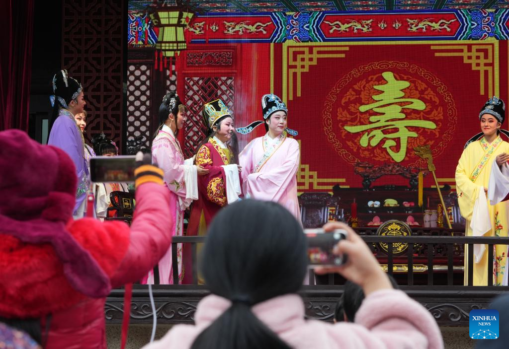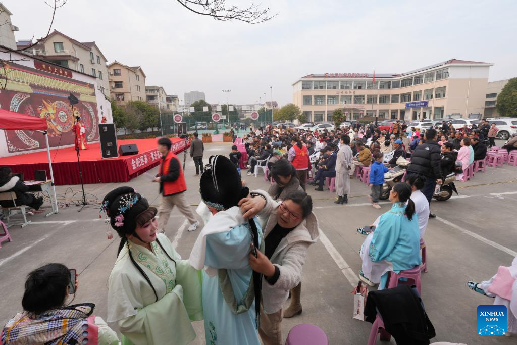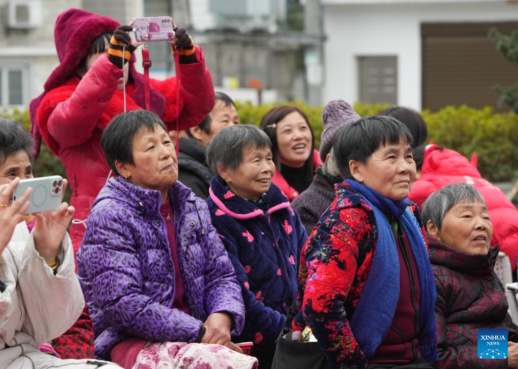 Villagers enjoy Shaoxing Opera performance in Lianzeng Village of Shaoxing City, east China's Zhejiang Province, Jan. 25, 2025. Shaoxing opera, also known as Yue opera, emerged in the early 1900s in east China's Zhejiang Province. Around the Spring Festival, opera troupes are busy performing at theaters, cultural halls, and temple fairs, creating a vibrant and festive atmosphere.
