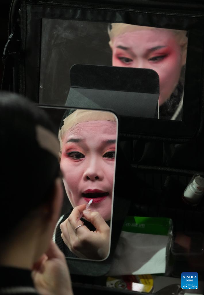 An artist prepares to perform Shaoxing Opera in Lianzeng Village of Shaoxing City, east China's Zhejiang Province, Jan. 25, 2025. Shaoxing opera, also known as Yue opera, emerged in the early 1900s in east China's Zhejiang Province. Around the Spring Festival, opera troupes are busy performing at theaters, cultural halls, and temple fairs, creating a vibrant and festive atmosphere.