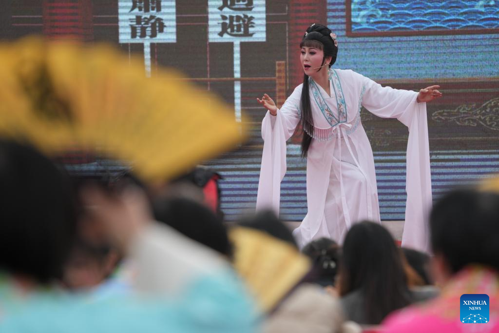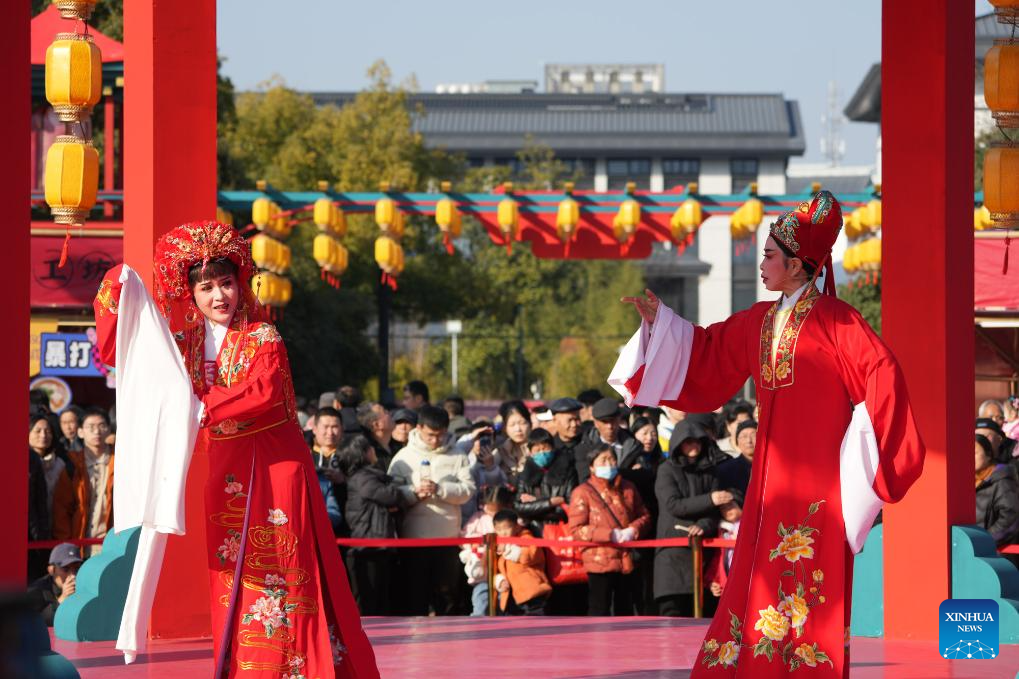 Artists perform Shaoxing Opera during an event celebrating the Spring Festival in Shaoxing City, east China's Zhejiang Province, Jan. 29, 2025. Shaoxing opera, also known as Yue opera, emerged in the early 1900s in east China's Zhejiang Province. Around the Spring Festival, opera troupes are busy performing at theaters, cultural halls, and temple fairs, creating a vibrant and festive atmosphere.