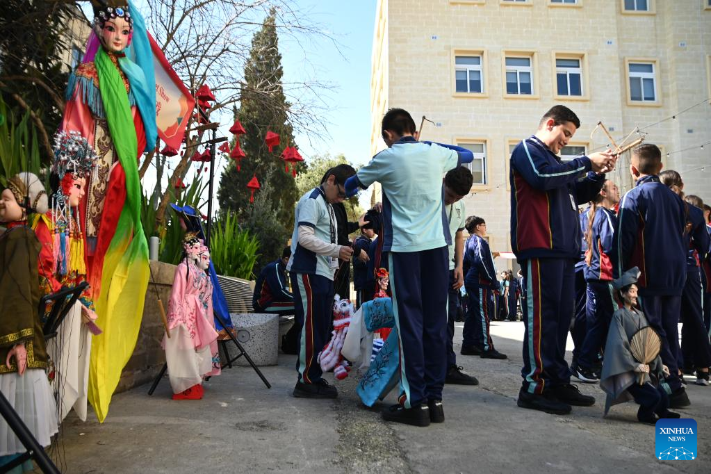 Students try to perform puppet show during the Chinese Spring Festival temple fair in Zejtun, Malta, on Feb. 6, 2025. The campus of St. Thomas More College's middle and secondary school in Zejtun, southeastern Malta, came alive with festive cheer on Thursday as students experienced the vibrant atmosphere of a traditional Chinese Spring Festival temple fair. Co-organized by the China Cultural Center in Malta and the Zhejiang Provincial Cultural Center, the event attracted over 500 students and teachers. (Photo by Jonathan Borg/Xinhua)