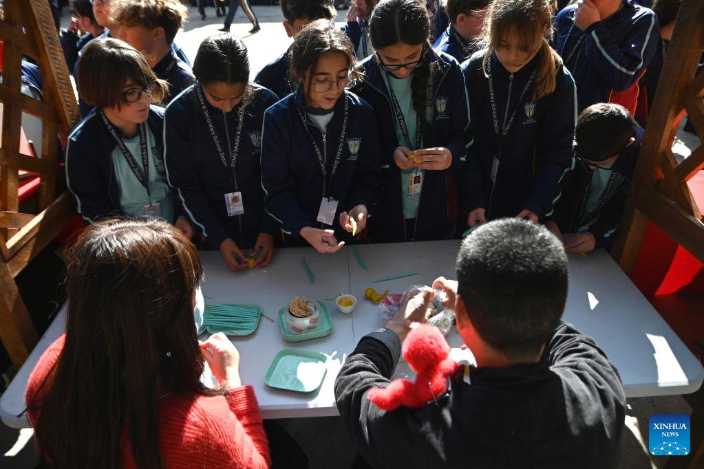 Students try to create sugar figurines during the Chinese Spring Festival temple fair in Zejtun, Malta, on Feb. 6, 2025. The campus of St. Thomas More College's middle and secondary school in Zejtun, southeastern Malta, came alive with festive cheer on Thursday as students experienced the vibrant atmosphere of a traditional Chinese Spring Festival temple fair. Co-organized by the China Cultural Center in Malta and the Zhejiang Provincial Cultural Center, the event attracted over 500 students and teachers. (Photo by Jonathan Borg/Xinhua)