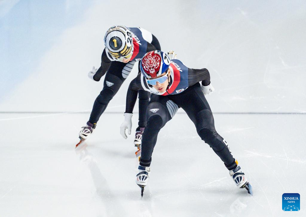 Jang Sungwoo (front) and Kim Gilli of South Korea compete during the mixed 2000m relay semifinal match of the short track speed skating event at the 9th Asian Winter Games in Harbin, northeast China's Heilongjiang Province, Feb. 7, 2025. (Xinhua/Sun Fei)