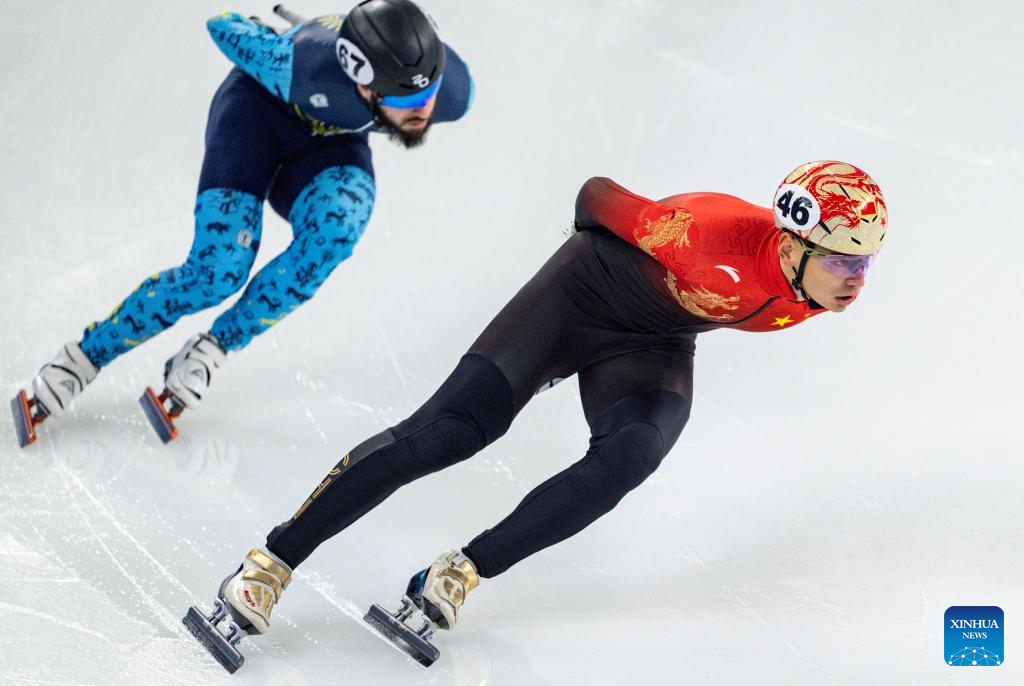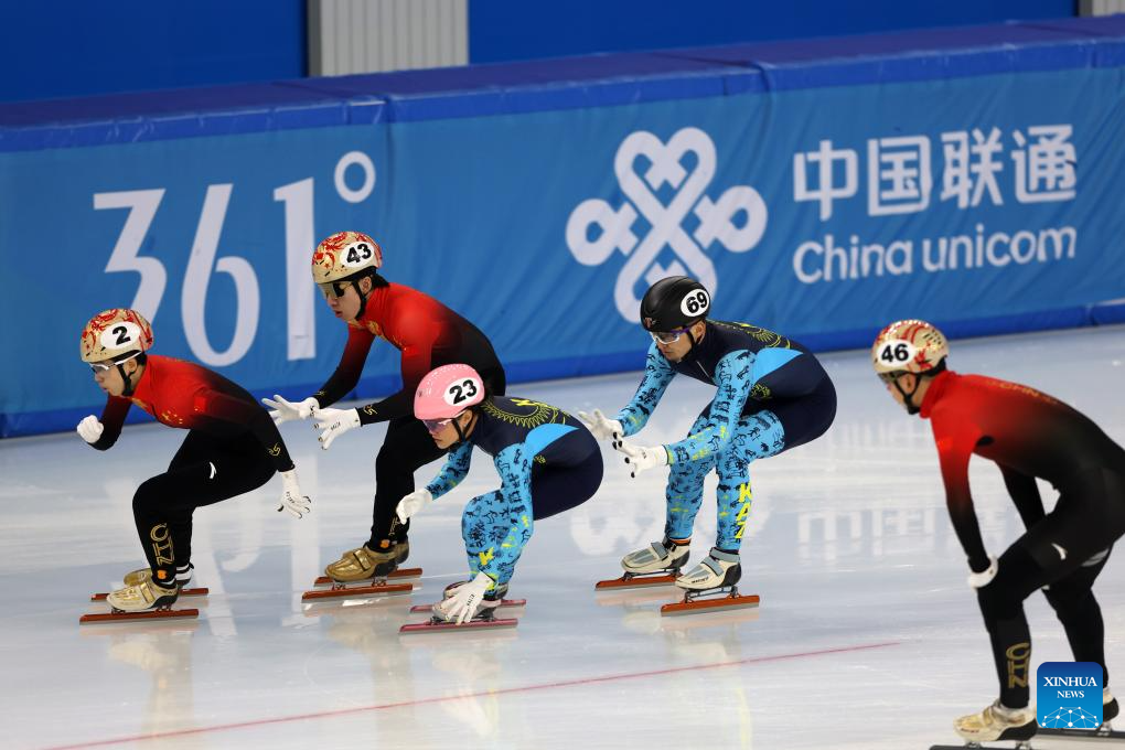 Liu Shaolin (R) of China competes during the mixed 2000m relay semifinal match of the short track speed skating event at the 9th Asian Winter Games in Harbin, northeast China's Heilongjiang Province, Feb. 7, 2025. (Xinhua/Sun Fei)