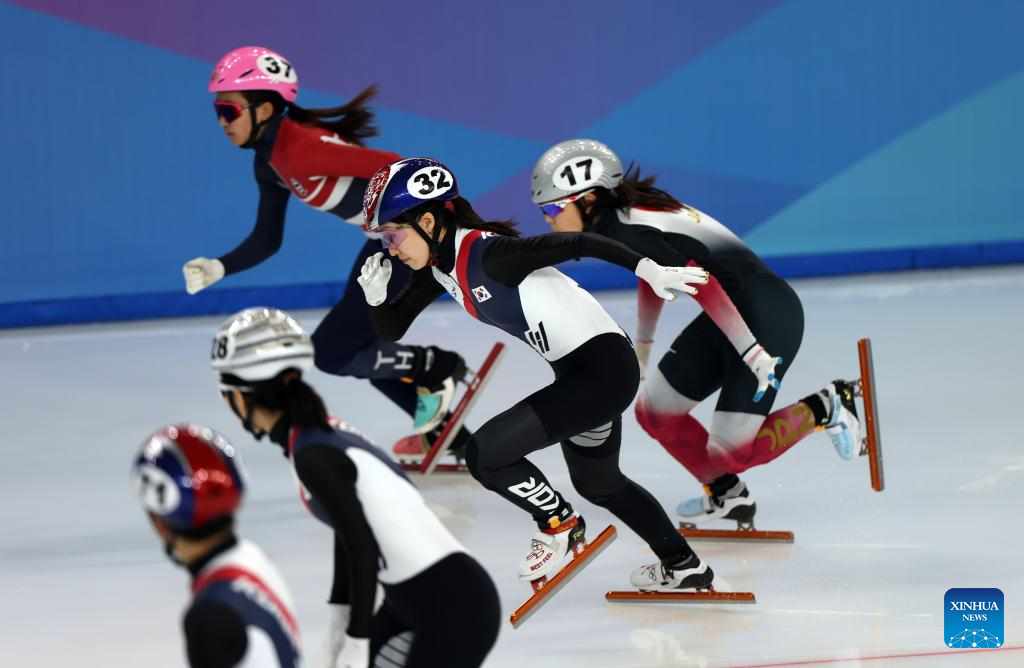 Choi Minjeong (2nd R) of South Korea competes during the mixed 2000m relay semifinal match of the short track speed skating event at the 9th Asian Winter Games in Harbin, northeast China's Heilongjiang Province, Feb. 7, 2025. (Xinhua/Ding Xu)