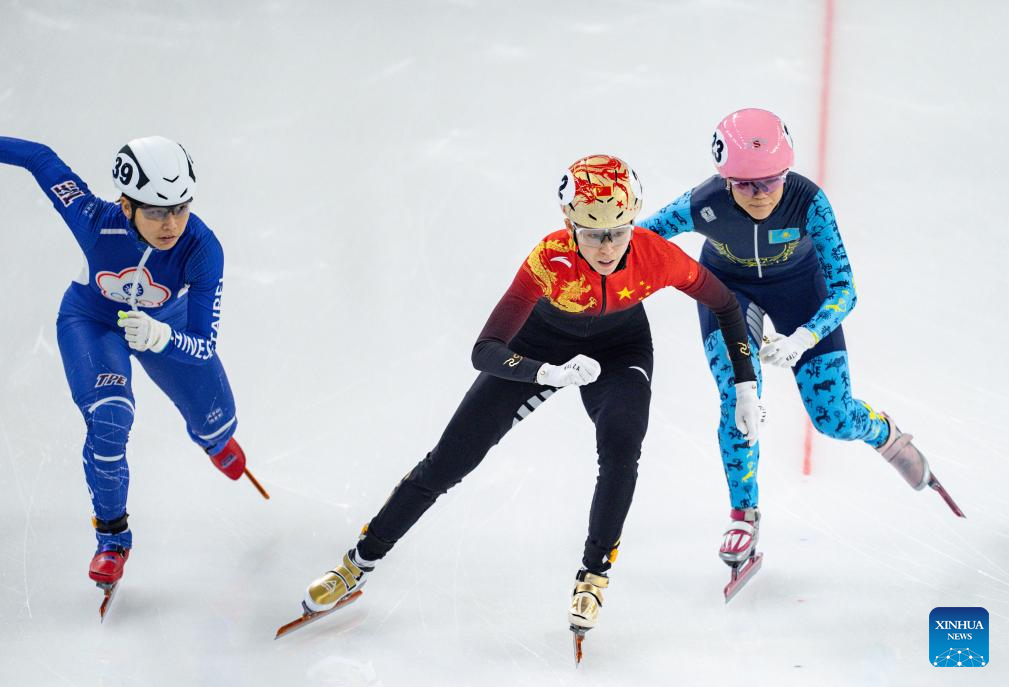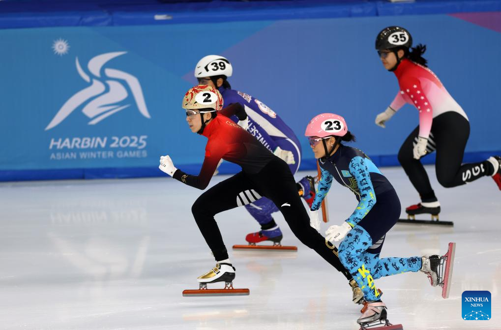 Fan Kexin (C) of China competes during the mixed 2000m relay semifinal match of the short track speed skating event at the 9th Asian Winter Games in Harbin, northeast China's Heilongjiang Province, Feb. 7, 2025. (Xinhua/Sun Fei)