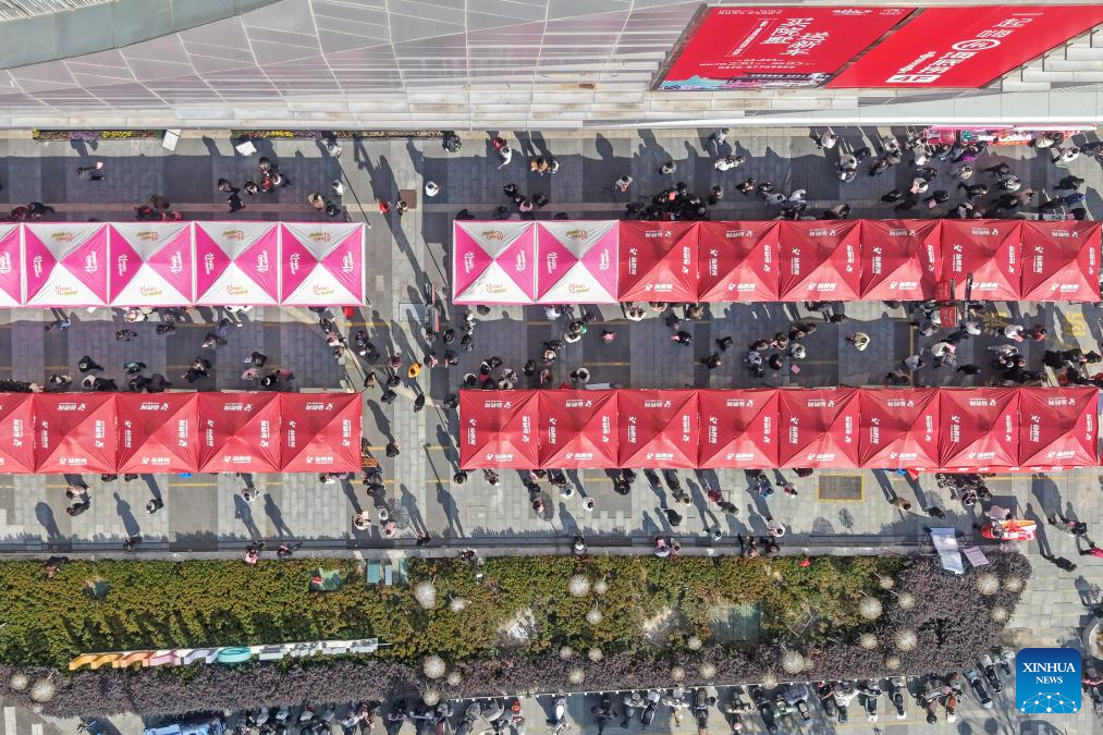 An aerial drone photo taken on Feb. 7, 2025 shows people attending a job fair in Taizhou, east China's Zhejiang Province. As the Spring Festival holiday ended, a variety of job fairs are held across the country. (Photo by Wang Huabin/Xinhua)