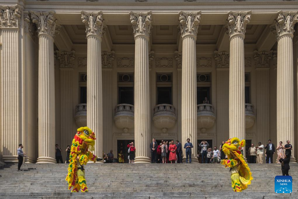 Lion dancers perform during an event celebrating the Spring Festival in front of Tiradentes Palace in Rio de Janeiro, Brazil, Feb. 6, 2025. (Photo by Claudia Martini/Xinhua)