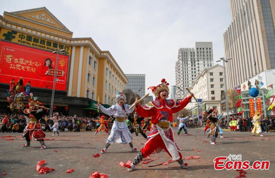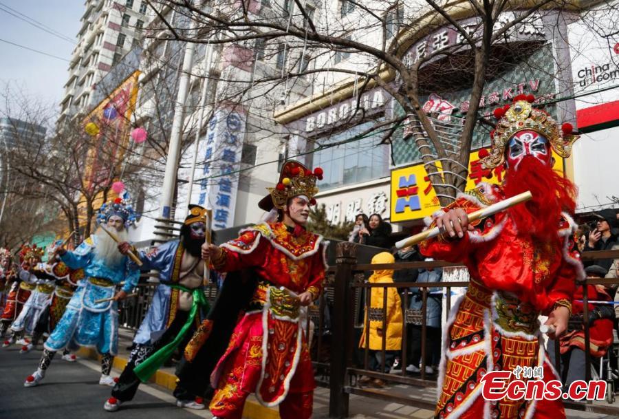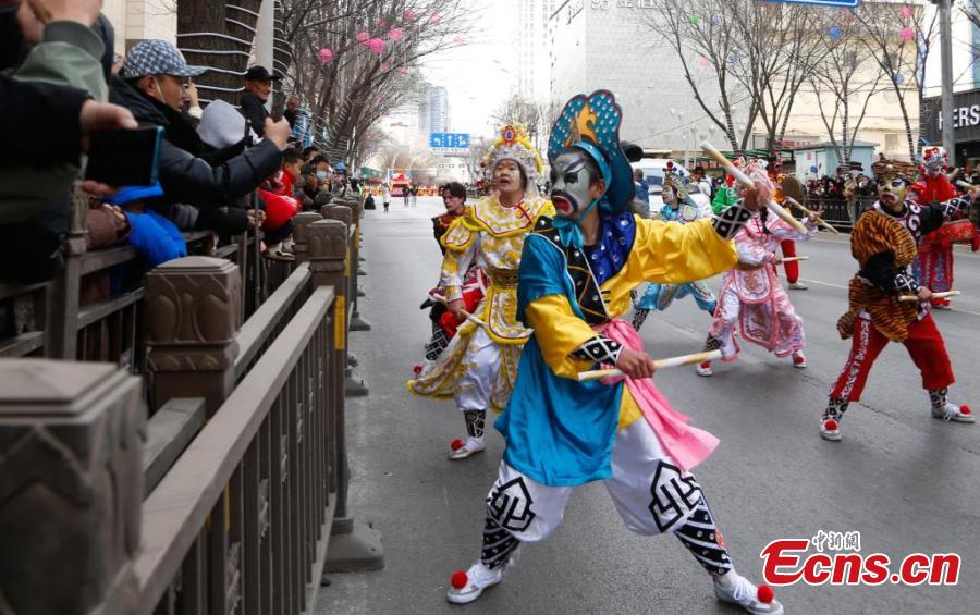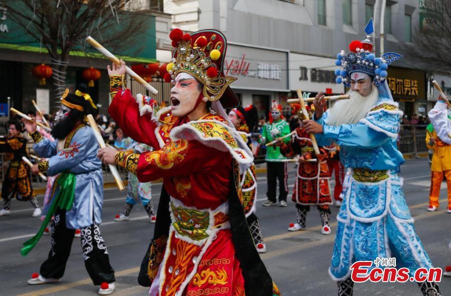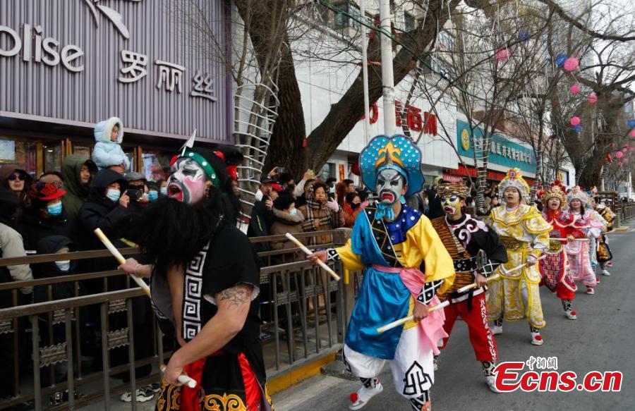 Dancers perform the Chaoshan Yingge dance, or "dance to the hero's song," in Xining, northwest China's Qinghai Province. (China News Service/Ma Mingyan)