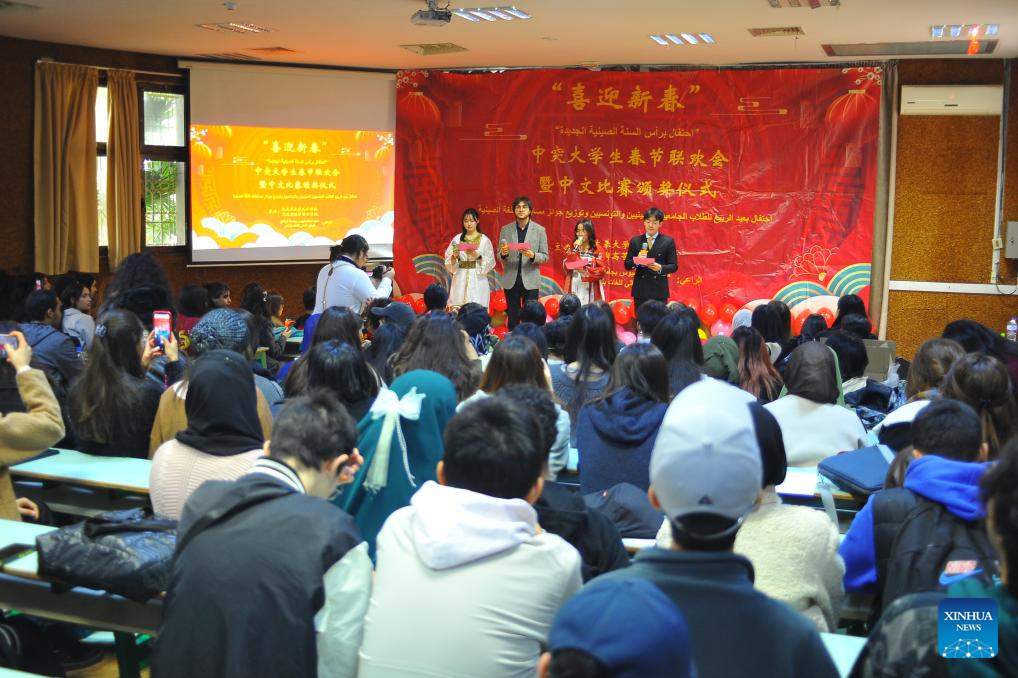 Tunisian students majoring in Chinese and Chinese students studying in Tunisia participate in a gala celebrating the Spring Festival at Carthage University in Tunis, Tunisia, Feb. 7, 2025. (Photo by Adel Ezzine/Xinhua)