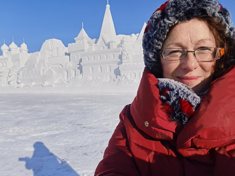 Camilla Eyres stands in front of an ice sculpture in Harbin, capital of northeast China's Heilongjiang Province. (Photo provided by Camilla Eyres)