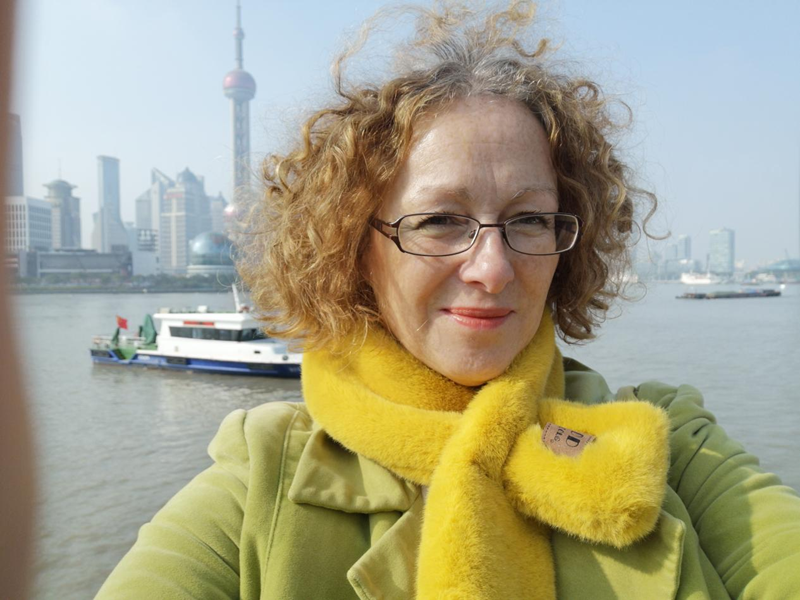 Camilla Eyres takes a photo with the Shanghai Oriental Pearl Tower in the background in east China's Shanghai. (Photo provided by Camilla Eyres)