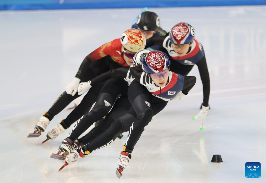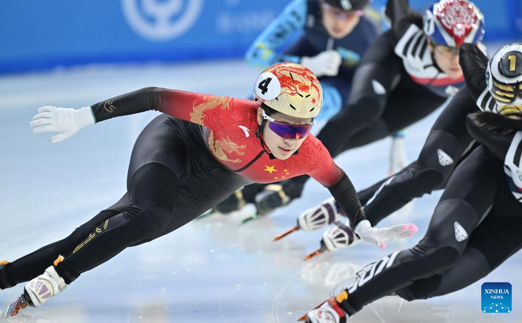 (from L to R) Kim Gilli, Choi Minjeong of South Korea, Zhang Chutong of China, Shim Sukhee of South Korea and Malika Yermek of Kazakhstan compete during the women's 1000m final match of the short track speed skating event at the 9th Asian Winter Games in Harbin, northeast China's Heilongjiang Province, Feb. 9, 2025. (Xinhua/Yan Linyun)