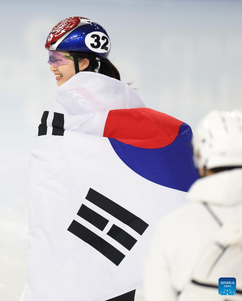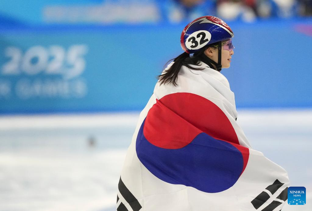 Choi Minjeong (L) of South Korea celebrates after the women's 1000m final match of the short track speed skating event at the 9th Asian Winter Games in Harbin, northeast China's Heilongjiang Province, Feb. 9, 2025. (Xinhua/Jiang Han)