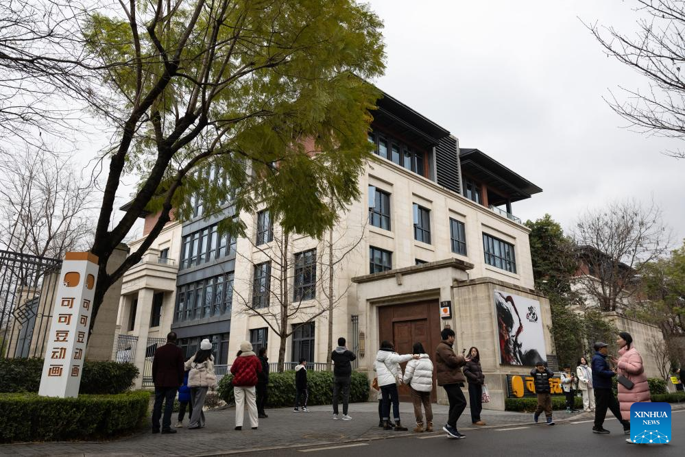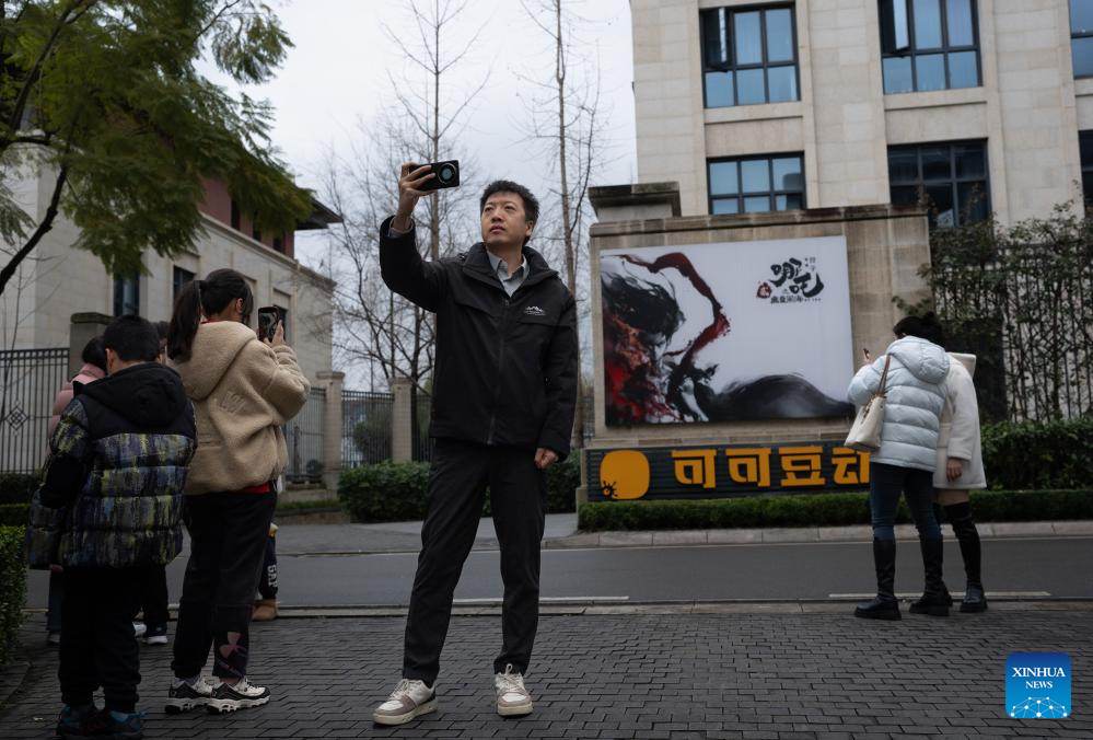 People take photos in front of Chengdu Coco Cartoon Co., Ltd., the company producing "Ne Zha 2," in Chengdu, southwest China's Sichuan Province, Feb. 8, 2025. According to ticketing platform Beacon, "Ne Zha 2" had already grossed over 6.79 billion yuan (about 947 million U.S. dollars) on the Chinese mainland by 9:11 p.m. Friday, overtaking the North American box office for "Star Wars: The Force Awakens" to become the highest-grossing film in a single market globally.