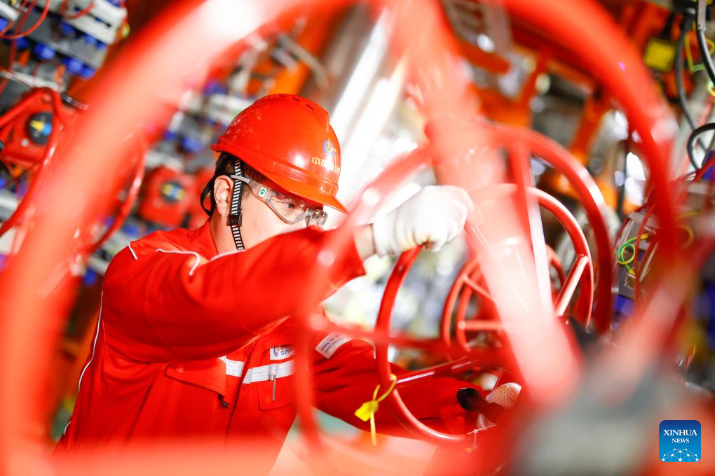 A worker checks the power supply system at an offshore production platform of the first phase of Bozhong 26-6 oilfield in China's Bohai Sea, Feb. 8, 2025. The first phase of Bozhong 26-6 oilfield, by far the largest metamorphic rock oilfield in the world, commenced production on Friday, according to its developer, the China National Offshore Oil Corporation (CNOOC) Tianjin branch.
