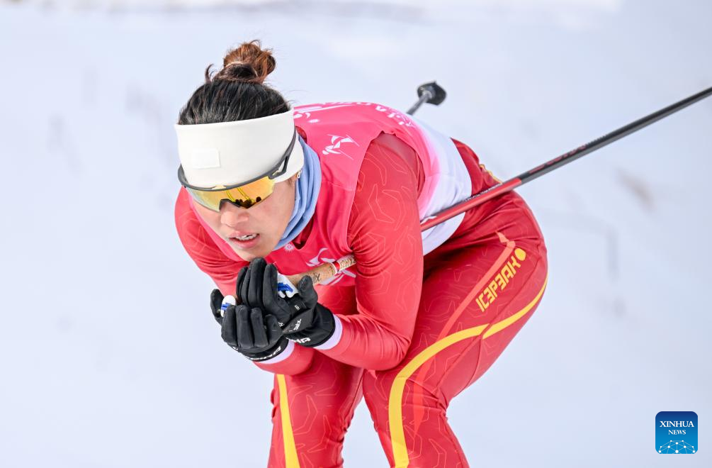 Dinigeer Yilamujiang of China competes during the women's sprint classic qualification match of the cross-country skiing event at the 9th Asian Winter Games in Yabuli, northeast China's Heilongjiang Province, Feb. 8, 2025. (Xinhua/Zhang Long)