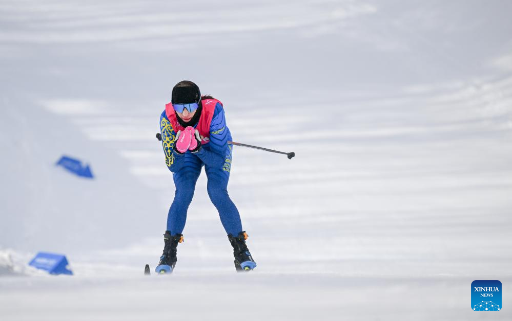 Darya Ryazhko of Kazakhstan competes during the women's sprint classic qualification match of the cross-country skiing event at the 9th Asian Winter Games in Yabuli, northeast China's Heilongjiang Province, Feb. 8, 2025. (Xinhua/Lian Zhen)