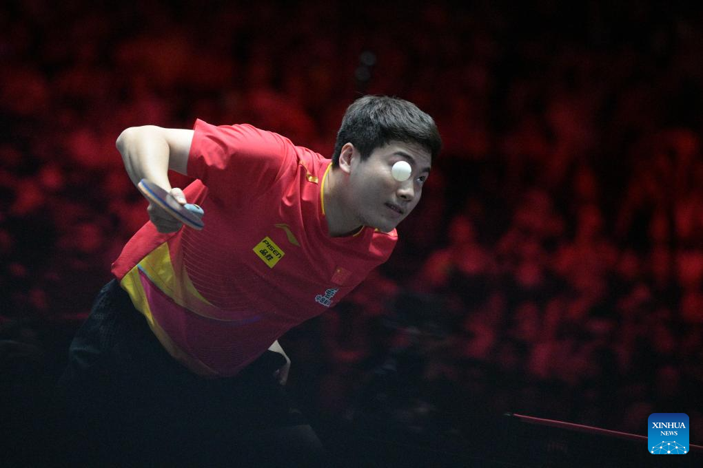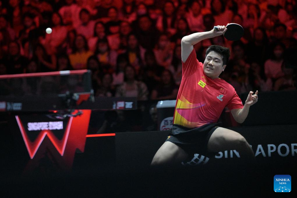 Lin Shidong hits a return during the men's singles final between Lin Shidong of China and Liang Jingkun of China at the World Table Tennis (WTT) Singapore Smash 2025 in Singapore, Feb. 9, 2025. (Photo by Then Chih Wey/Xinhua)