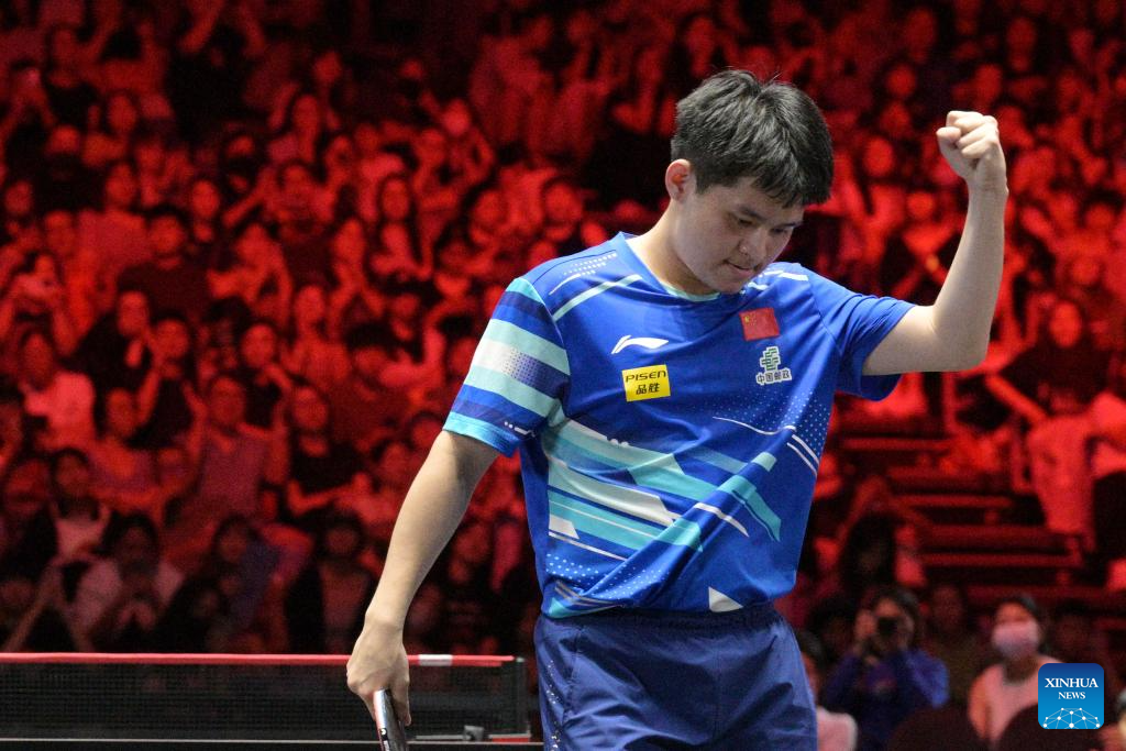Lin Shidong celebrates winning the men's singles final between Lin Shidong of China and Liang Jingkun of China at the World Table Tennis (WTT) Singapore Smash 2025 in Singapore, Feb. 9, 2025. (Photo by Then Chih Wey/Xinhua)