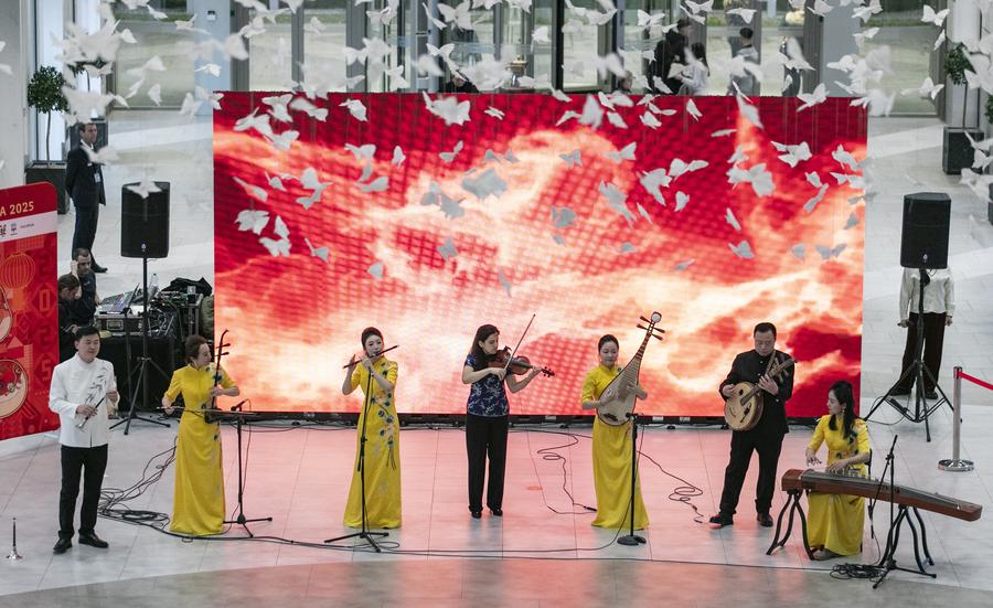 Artists from the Hubei Performing Arts Group play traditional Chinese instruments during "Charming Hubei" flash mob in Belgrade, Serbia, Feb. 8, 2025. The Arts Group brought a vibrant showcase of Chinese folk arts to Belgrade, on Saturday evening with a flash performance at Galerija Shopping Mall, as part of Serbia's Spring Festival celebrations. (Photo by Wang Wei/Xinhua)