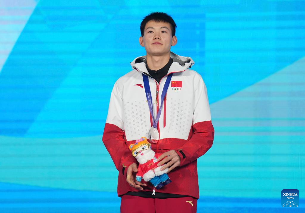 Silver medalist Zhang Chenghao of China poses during the awarding ceremony after the ski mountaineering men's sprint final at the 9th Asian Winter Games in Yabuli, northeast China's Heilongjiang Province, Feb. 9, 2025. (Xinhua/Wang Song)