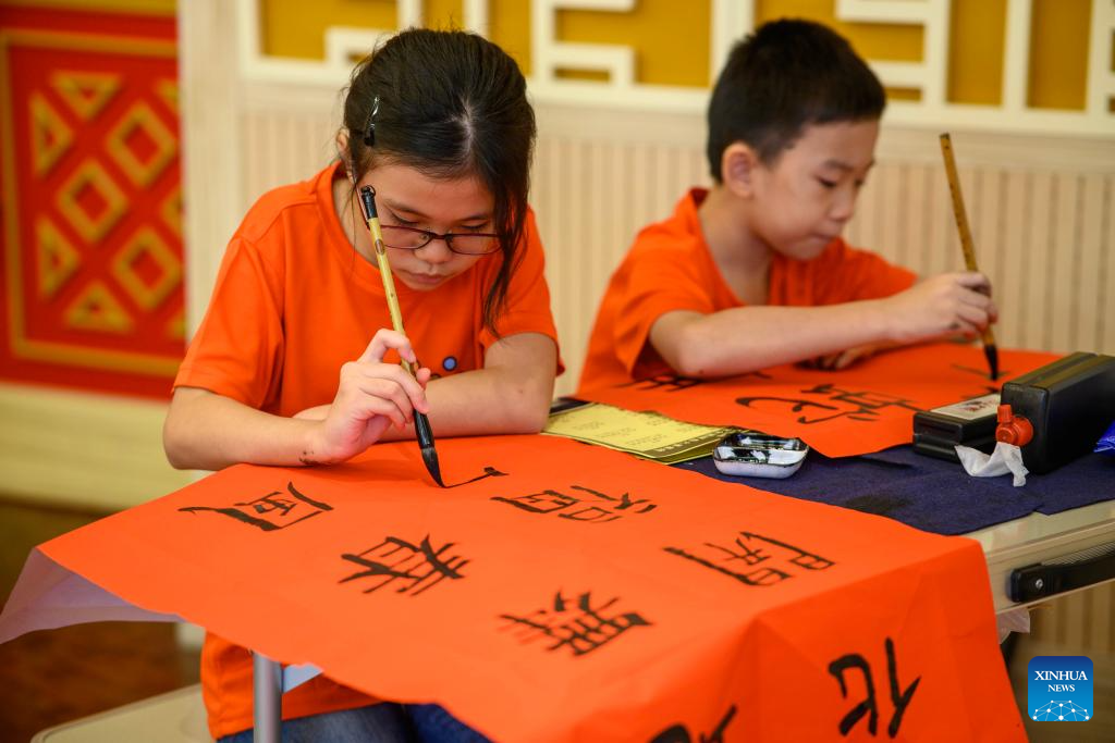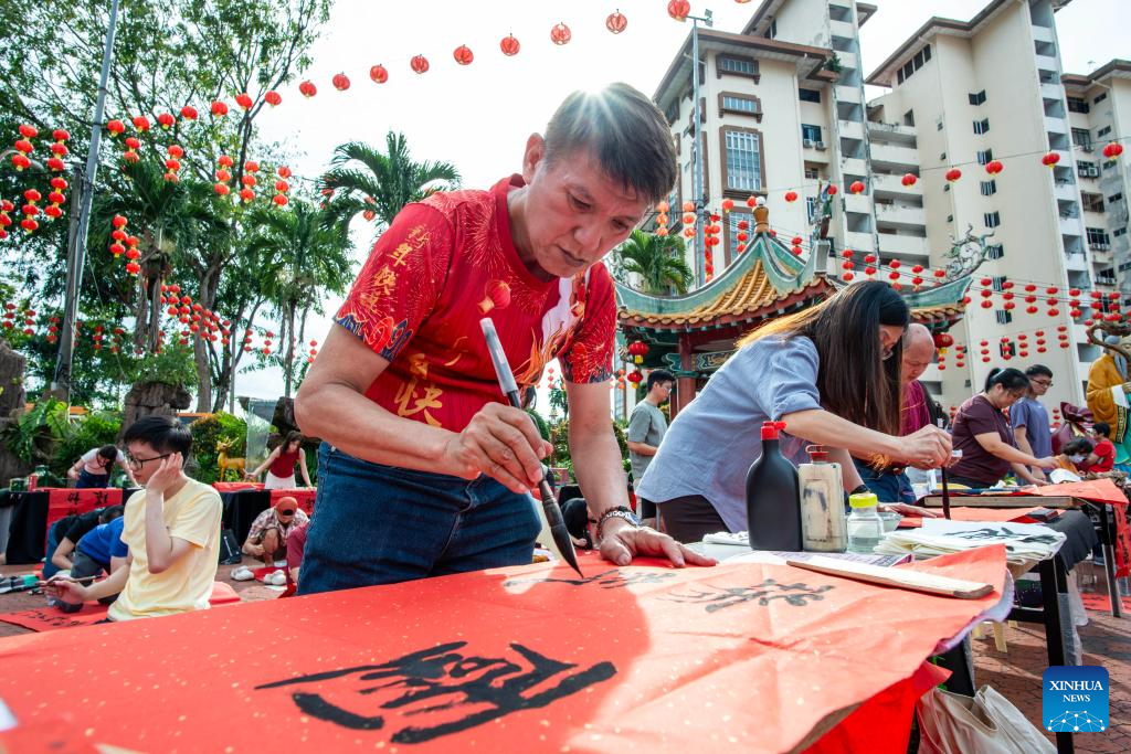 People participate in a Chinese calligraphy competition in Kuala Lumpur, Malaysia, Feb. 9, 2025. A competition of traditional Chinese calligraphy was held in Kuala Lumpur in celebration of the Chinese New Year, which attracted over 300 participants. (Photo by Chong Voon Chung/Xinhua)