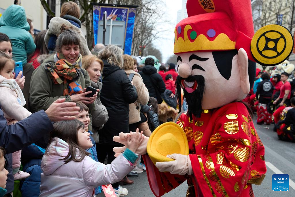 People have fun at a Chinese New Year parade in Paris, France, Feb. 9, 2025. (Xinhua/Meng Dingbo)
