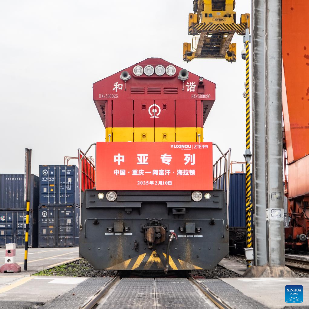 This photo shows a cargo train before departure at the Tuanjiecun Station in Chongqing, southwest China, Feb. 10, 2025. A freight train loaded with 55 forty-foot equivalent unit containers left Chongqing on Monday for Afghanistan's port city of Hairatan, marking the first trip of the direct freight train service between two cities. (Xinhua/Tang Yi)