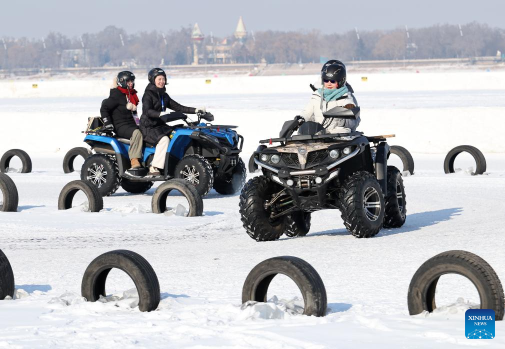 Tourists have fun at the Harbin Songhua River Ice and Snow Carnival in Harbin, northeast China's Heilongjiang Province, Feb. 9, 2025. With the 9th Asian Winter Games underway, Harbin is attracting numerous domestic and international visitors to enjoy the beauty of winter scenery. (Xinhua/Hou Jun)