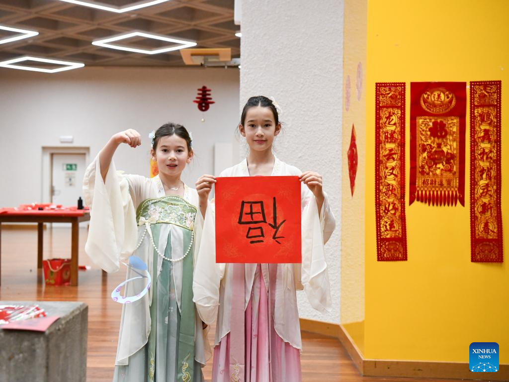 Annabelle (L) and Emily, students of Geneva Chinese School, display a snake-shaped paper cutting and a Chinese calligraphy work during a Spring Festival Gala to celebrate the Chinese New Year at Geneva Chinese School in Geneva, Switzerland, Feb. 9, 2025. Geneva Chinese School held a Spring Festival Gala on Sunday to celebrate the Chinese New Year, with over 20 performances staged by students and their teachers and parents. The event aimed to celebrate the Spring Festival, promote Chinese culture, and showcase the students' achievements in learning the Chinese language. (Xinhua/Lian Yi)