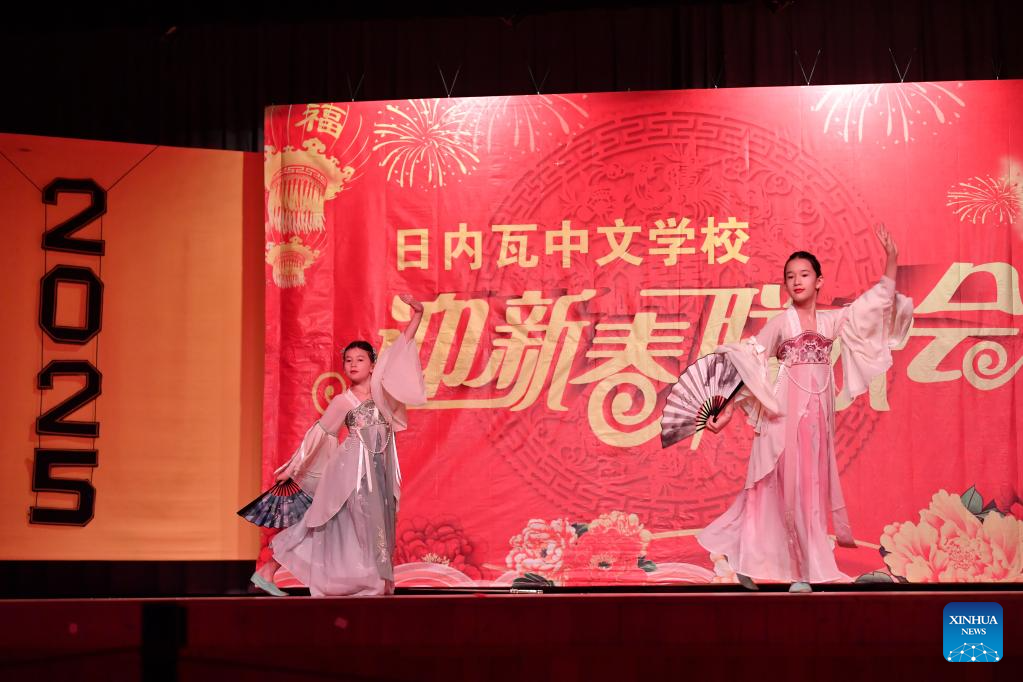 Students perform during a Spring Festival Gala to celebrate the Chinese New Year at Geneva Chinese School in Geneva, Switzerland, Feb. 9, 2025. Geneva Chinese School held a Spring Festival Gala on Sunday to celebrate the Chinese New Year, with over 20 performances staged by students and their teachers and parents. The event aimed to celebrate the Spring Festival, promote Chinese culture, and showcase the students' achievements in learning the Chinese language. (Xinhua/Lian Yi)
