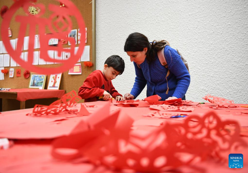 A woman demonstrates to her daughter how to make Chinese paper cutting during a Spring Festival Gala to celebrate the Chinese New Year at Geneva Chinese School in Geneva, Switzerland, Feb. 9, 2025. Geneva Chinese School held a Spring Festival Gala on Sunday to celebrate the Chinese New Year, with over 20 performances staged by students and their teachers and parents. The event aimed to celebrate the Spring Festival, promote Chinese culture, and showcase the students' achievements in learning the Chinese language. (Xinhua/Lian Yi)