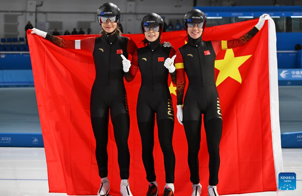 Yang Binyu (L, front), Ahenaer Adake (C, front) and Han Mei (R, front) of China celebrate after the women's team pursuit of the speed skating event at the 9th Asian Winter Games in Harbin, northeast China's Heilongjiang Province, Feb. 11, 2025. (Xinhua/Chen Zhenhai)