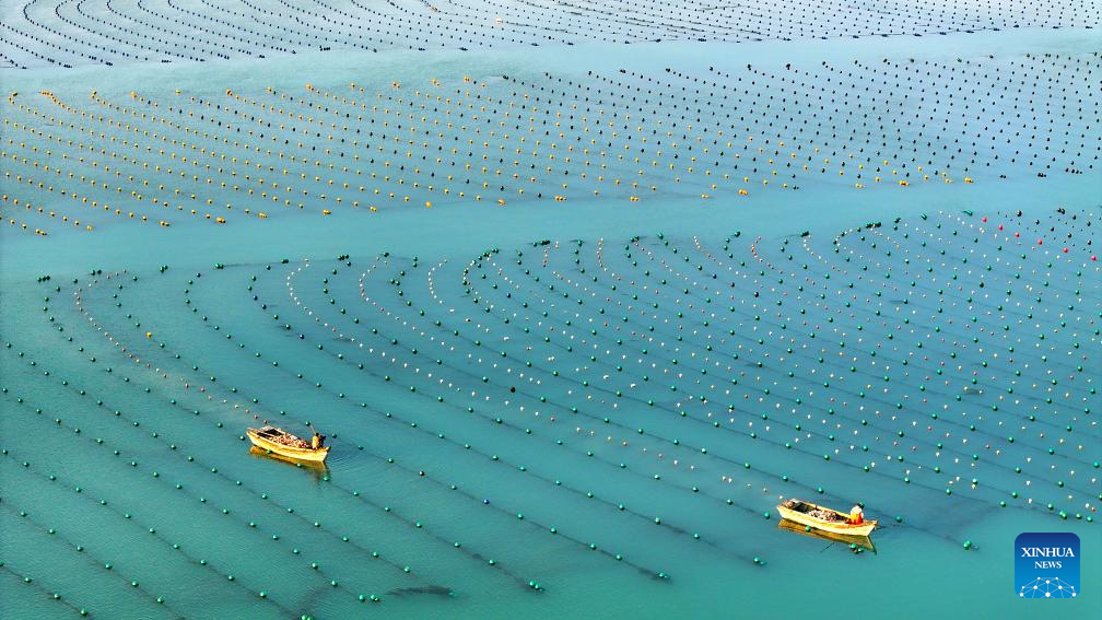 An aerial drone photo taken on Feb. 11, 2025 shows fishermen working at the kelp breeding area in Rongcheng City, east China's Shandong Province. (Photo by Yang Zhili/Xinhua)
