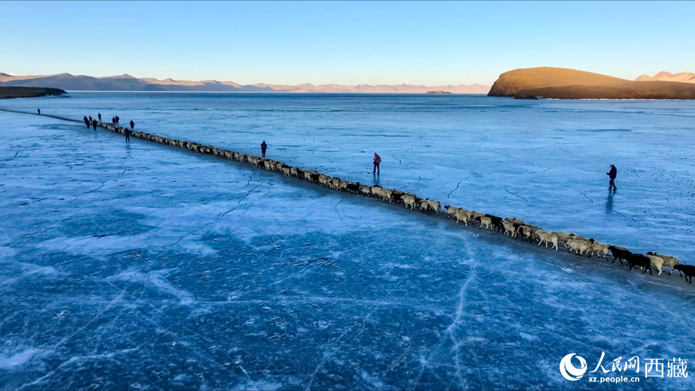 The herdsmen were all set and ready to go. Wrapped in their thick robes, they guided their flock of sheep onto the icy lake. From a distance, the sheep, resembling black and white pearls, slowly moved on the azure ice, painting a breathtaking picture on the vast plateau.