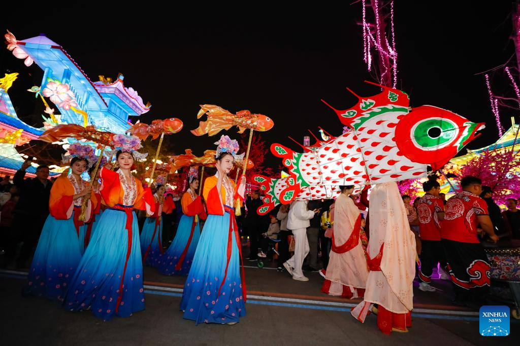 Actors participate in a parade during the 54th Chengdu international panda lantern fair in Chengdu, southwest China's Sichuan Province, Feb. 12, 2025. Various activities were held across China to celebrate the Lantern Festival, which falls on the fifteenth day of the first month of the Chinese lunar calendar. (Xinhua/Shen Bohan)